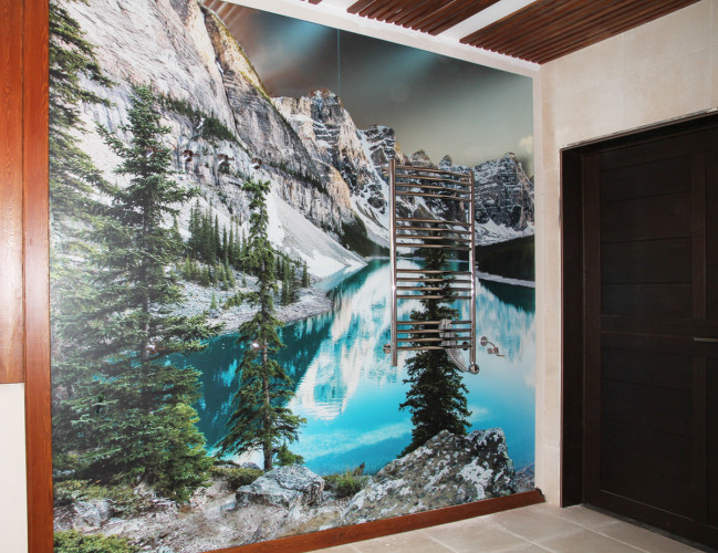 Перегородка выполнена из стекла Оптивайт и УФ печатью за стеклом